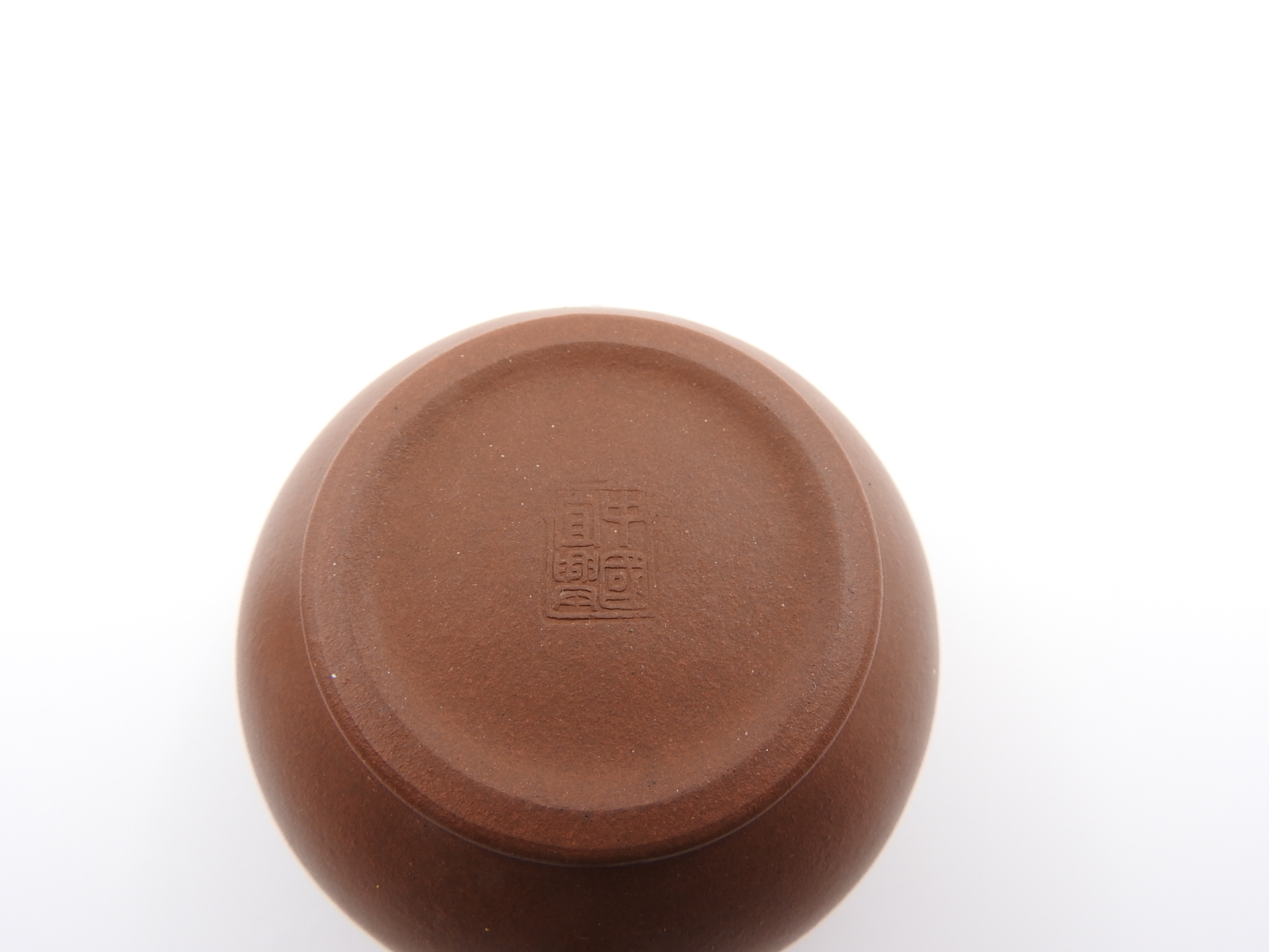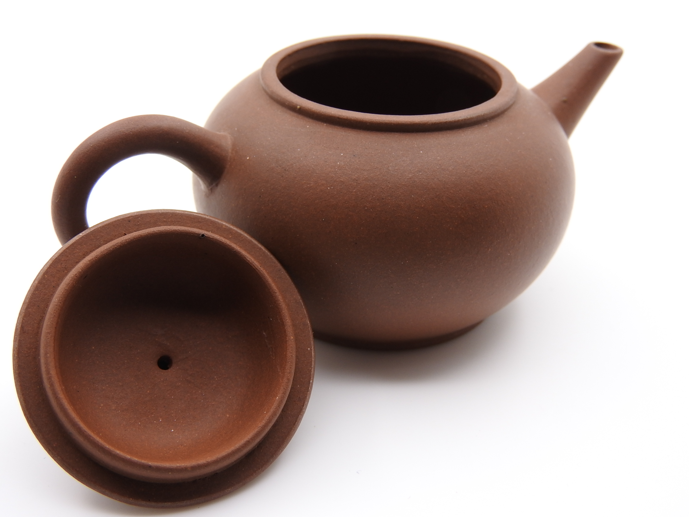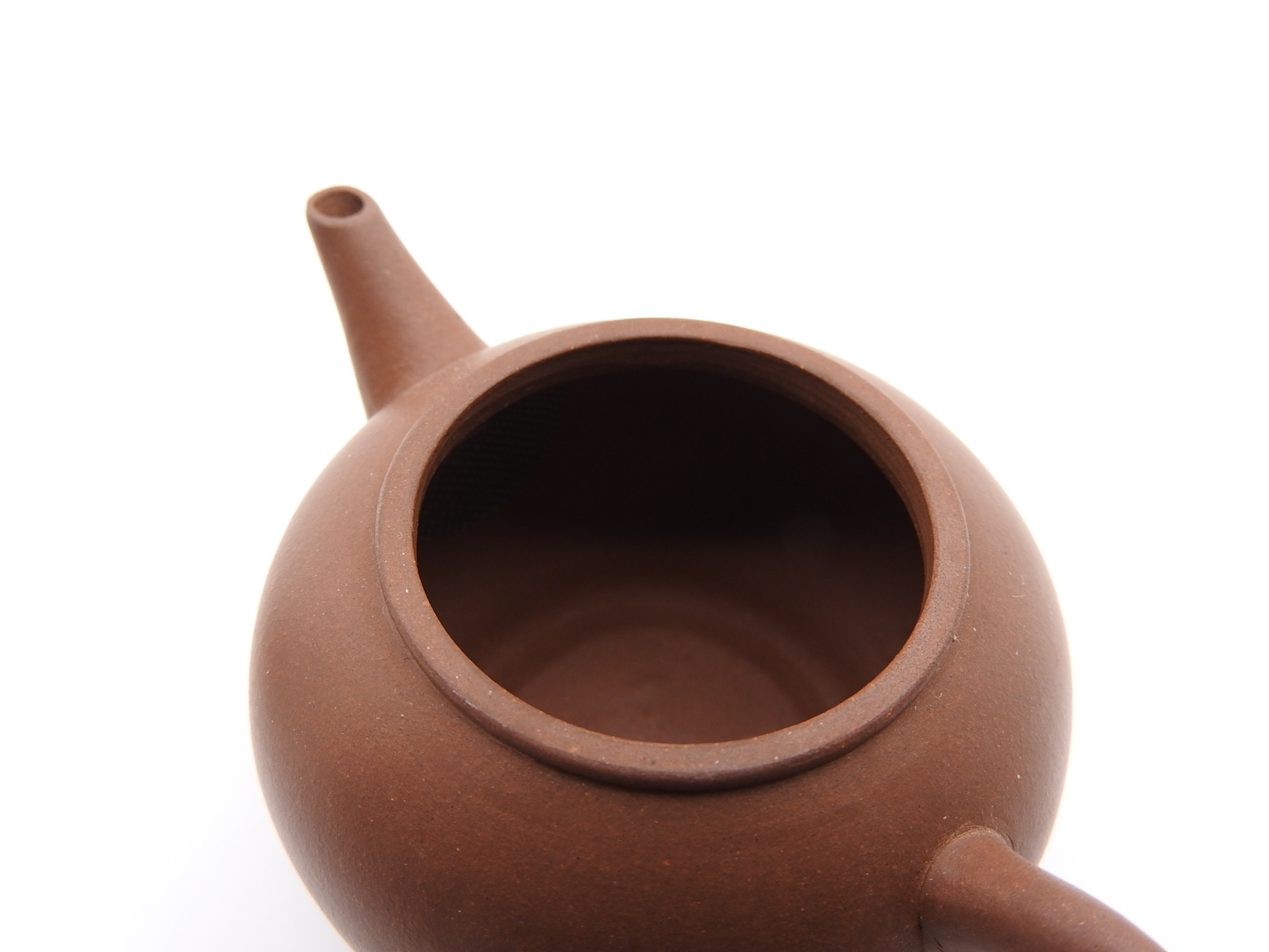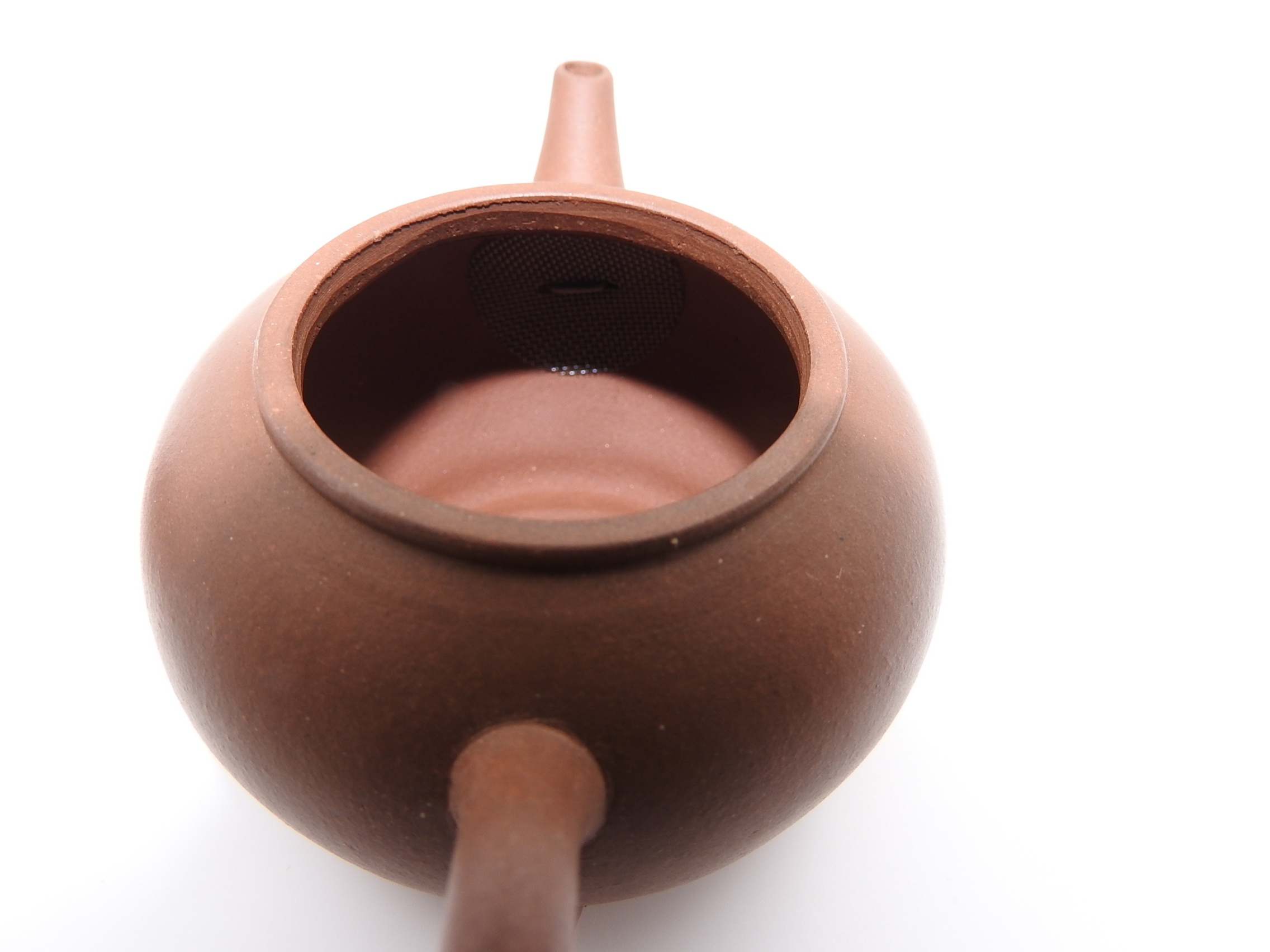 You can expect some natural kiln cracks on the (outer) surface of the clay, not perfectly aligned spout, knob and handle, tooling marks on the lid and mouth of the teapot, etc. Also, other natural signs from the kiln, i.e. black spots, which are iron oxide that melted during the firing. In addition, finding mica chips inside and outside of the teapot that look like tiny, shiny metal spots and are silvery in appearance is frequent for these teapots. Another common trait is the presence of larger sand grains protruding on the surface of the clay, which push their way out during firing as the material contracts (an example of this can be seen in the fourth picture, on the teapot’s spout).